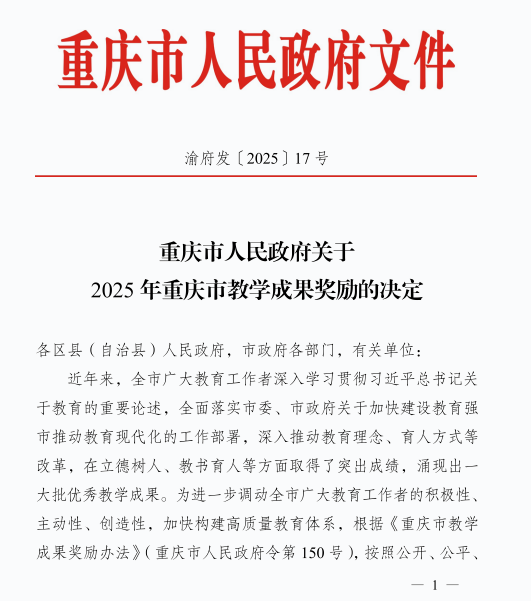 近日,重慶市人民政府印發(fā)《關(guān)于2025年重慶市教學(xué)成果獎(jiǎng)勵(lì)的決定》(渝府發(fā)【2025】7號(hào)),我校榮獲2025年職業(yè)教育重慶市教學(xué)成果獎(jiǎng)特等獎(jiǎng)1項(xiàng)、二等獎(jiǎng)1項(xiàng)。